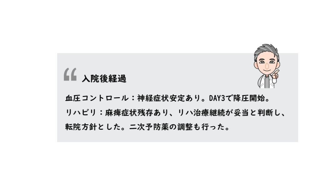#143. 入院後経過 血圧コントロール:神経症状安定あり。DAY3で降圧開始。