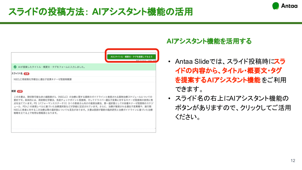 スライドの投稿方法: AIアシスタント機能の活用 AIアシスタント機能を活用する • Antaa Slideでは、スライド投稿時にスラ イドの内容から、タイトル・概要文・タグ を提案するAIアシスタント機能 をご利用 できます。 • スライド名の右上にAIアシスタント機能の ボタンがありますので、クリックしてご活用 ください。 12 スライドの公開範囲設定とアップロード手順 #13.