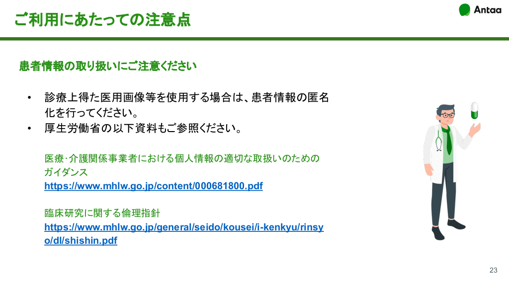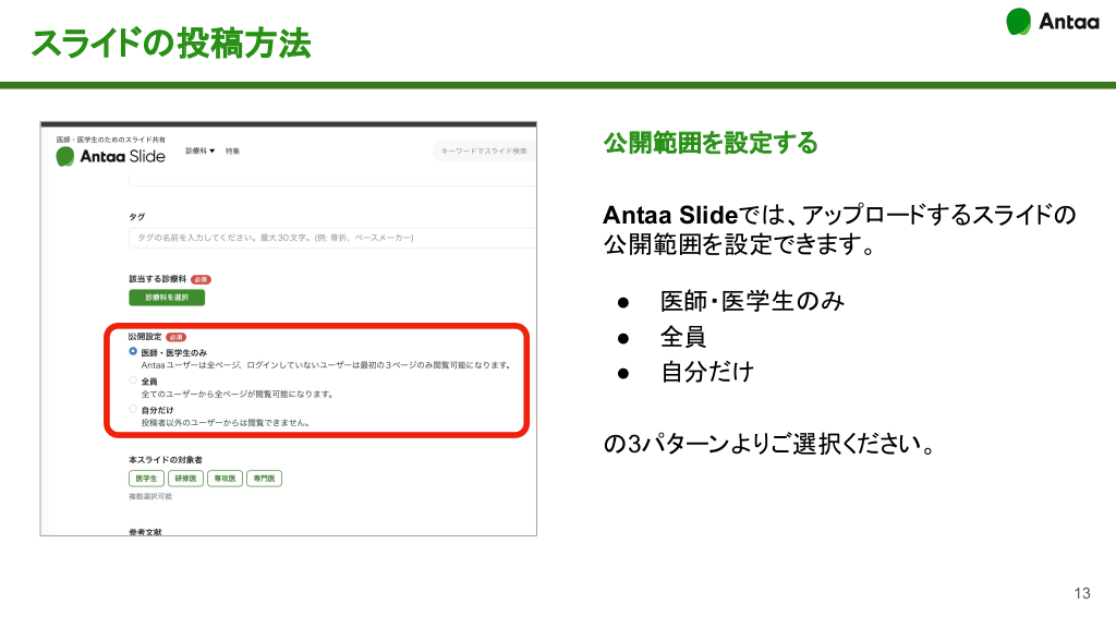 スライドの投稿方法 公開範囲を設定する Antaa Slideでは、アップロードするスライドの 公開範囲を設定できます。 ● ● ● 医師・医学生のみ 全員 自分だけ の3パターンよりご選択ください。 13 #14.