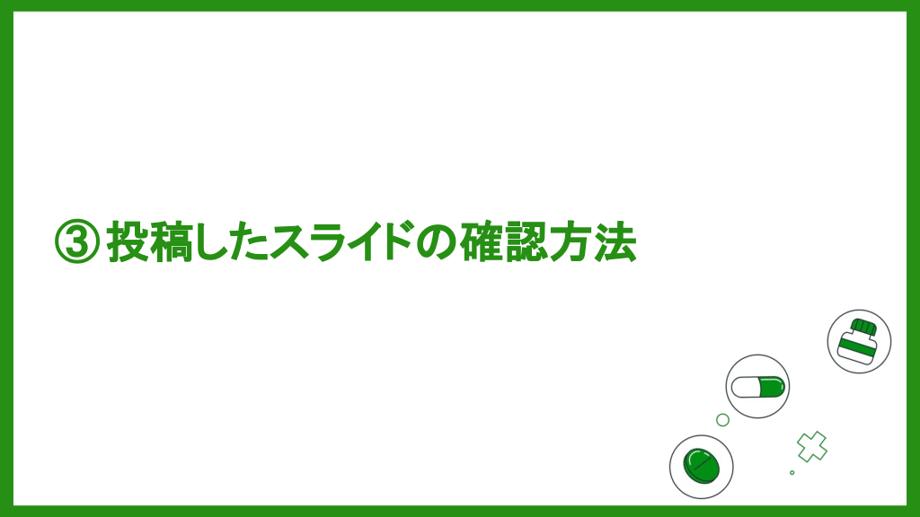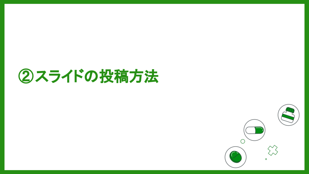 スライドの投稿方法 スライド投稿画面にアクセスする ログイン後、画面上部に表示される 「スライド投稿 」をクリックして、投稿画面に移 動します。 7 #8.