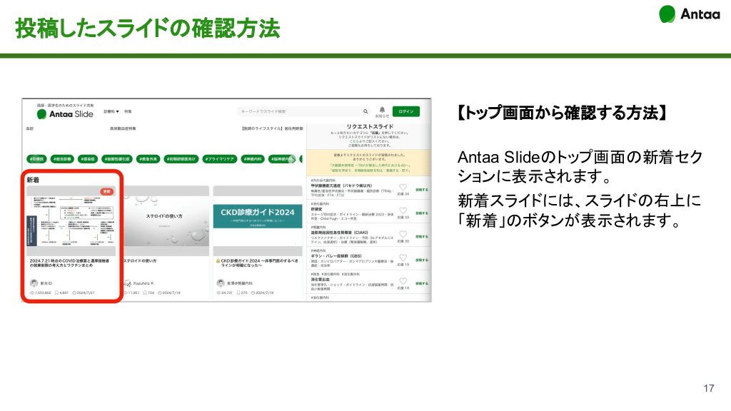 投稿したスライドの確認方法 【トップ画面から確認する方法】 Antaa Slideのトップ画面の新着セク ションに表示されます。 新着スライドには、スライドの右上に 「新着」のボタンが表示されます。 17 #18.