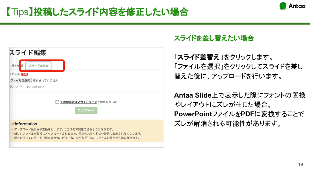 【Tips】投稿したスライド内容を修正したい場合 スライドを差し替えたい場合 「スライド差替え 」をクリックします。 「ファイルを選択」をクリックしてスライドを差し 替えた後に、アップロードを行います。 Antaa Slide上で表示した際にフォントの置換 やレイアウトにズレが生じた場合、 PowerPointファイルをPDFに変換することで ズレが解消される可能性があります。 19 #20.
