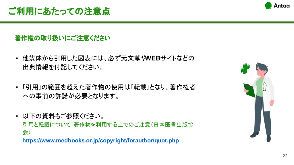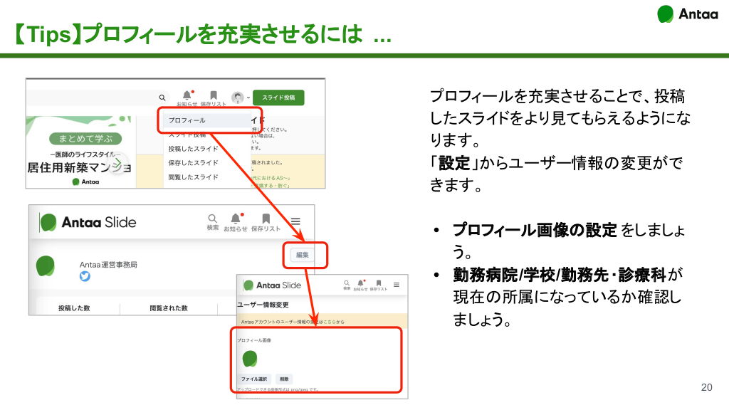 【Tips】プロフィールを充実させるには ... プロフィールを充実させることで、投稿 したスライドをより見てもらえるようにな ります。 「設定」からユーザー情報の変更がで きます。 • プロフィール画像の設定 をしましょ う。 • 勤務病院/学校/勤務先・診療科が 現在の所属になっているか確認し ましょう。 20 ご利用にあたっての注意点と著作権の取り扱い 投稿をお待ちしておりますのメッセージ