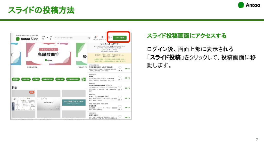 Antaa Slideのログイン方法 A. アカウント登録済みの方 「メールアドレス」と「パスワード」を A 入力して、ログインしてください。 B. アカウント未登録の方 画面下部の「アカウント登録」より 登録をお願いします。 B 登録には、医師資格登録年度または 医学部卒業見込み年度の入力が必要です。 5 スライドの投稿方法と必要事項の入力 #7.