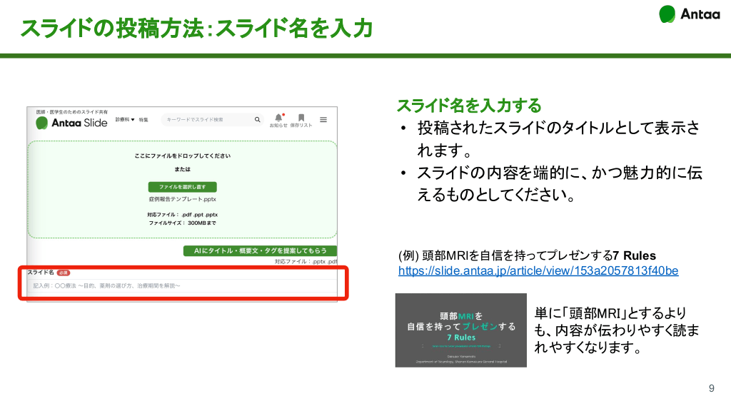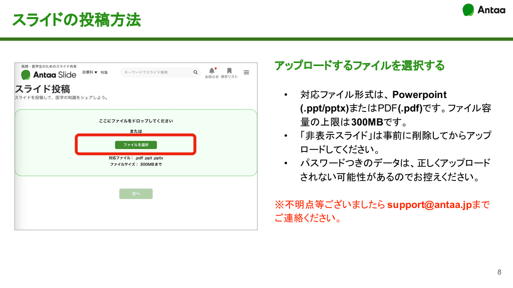 スライドの投稿方法 アップロードするファイルを選択する • • • 対応ファイル形式は、 Powerpoint (.ppt/pptx)またはPDF(.pdf)です。ファイル容 量の上限は300MBです。 「非表示スライド」は事前に削除してからアップ ロードしてください。 パスワードつきのデータは、正しくアップロード されない可能性があるのでお控えください。 ※不明点等ございましたら support@antaa.jpまで ご連絡ください。 8 #10.