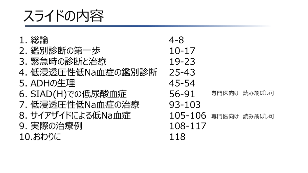 低Na血症は、医療現場で頻繁に直面する問題の一つであり、特に65歳以上の入院患者に多く見られます。このガイドでは、低Na血症の診断から治療までの包括的なアプローチを提供します。鑑別診断の初歩から、血清ナトリウムレベルが135mEq/L未満の患者の取り扱い、急性および慢性の低Na血症の分類、治療に至るまでの流れを詳細に説明しています。また、低浸透圧性低Na血症の鑑別診断、ADHの生理作用、SIAD(H)での低尿酸血症に至るまで幅広く触れており、サイアザイドによる低Na血症や緊急時の治療戦略など、実際の治療例を基にした具体的な指針も提供します。このガイドは専門医向けであり、日常の臨床で直面する低Na血症の症例に対して、効果的な診断と治療法を提案することを目的としています。(AI作成そのまま)