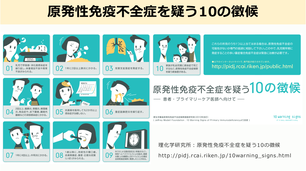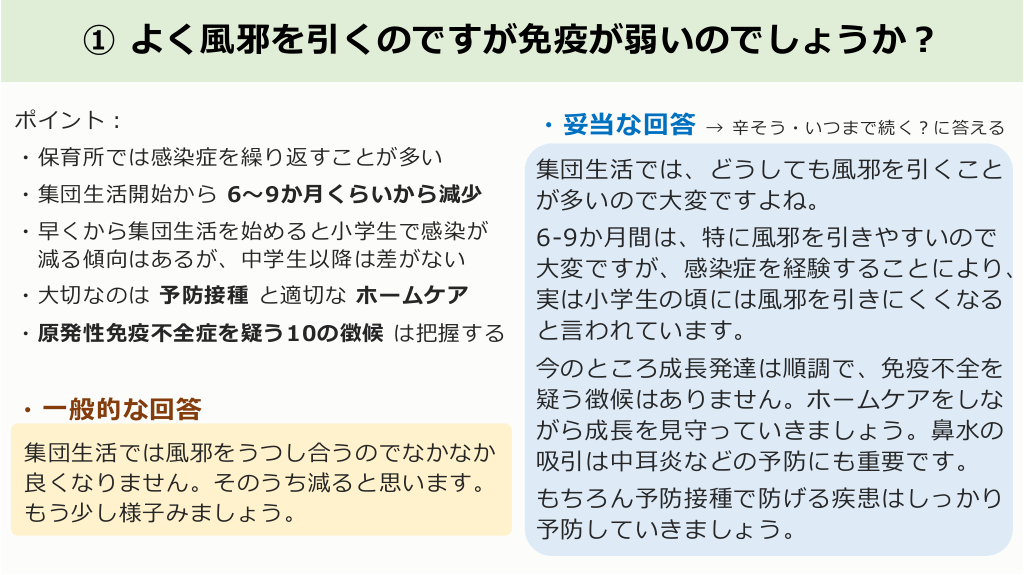 ① よく⾵邪を引くのですが免疫が弱いのでしょうか︖ ポイント︓ ・保育所では感染症を繰り返すことが多い ・集団⽣活開始から 6〜9か⽉くらいから減少 ・早くから集団⽣活を始めると⼩学⽣で感染が 減る傾向はあるが、中学⽣以降は差がない ・⼤切なのは 予防接種 と適切な ホームケア ・原発性免疫不全症を疑う10の徴候 は把握する ・⼀般的な回答 集団⽣活では⾵邪をうつし合うのでなかなか 良くなりません。そのうち減ると思います。 もう少し様⼦みましょう。 ・妥当な回答 → ⾟そう・いつまで続く︖に答える 集団⽣活では、どうしても⾵邪を引くこと が多いので⼤変ですよね。 6-9か⽉間は、特に⾵邪を引きやすいので ⼤変ですが、感染症を経験することにより、 実は⼩学⽣の頃には⾵邪を引きにくくなる と⾔われています。 今のところ成⻑発達は順調で、免疫不全を 疑う徴候はありません。ホームケアをしな がら成⻑を⾒守っていきましょう。⿐⽔の 吸引は中⽿炎などの予防にも重要です。 もちろん予防接種で防げる疾患はしっかり 予防していきましょう。 予防接種の重要性と親の不安への対応 #11.