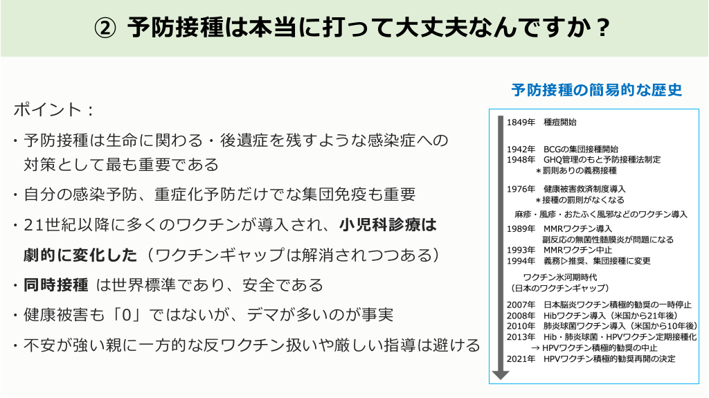 ② 予防接種は本当に打って⼤丈夫なんですか︖ ポイント︓ ・予防接種は⽣命に関わる・後遺症を残すような感染症への 対策として最も重要である ・⾃分の感染予防、重症化予防だけでな集団免疫も重要 ・21世紀以降に多くのワクチンが導⼊され、⼩児科診療は 劇的に変化した(ワクチンギャップは解消されつつある) ・同時接種 は世界標準であり、安全である ・健康被害も「0」ではないが、デマが多いのが事実 ・不安が強い親に⼀⽅的な反ワクチン扱いや厳しい指導は避ける 予防接種の簡易的な歴史 #12.