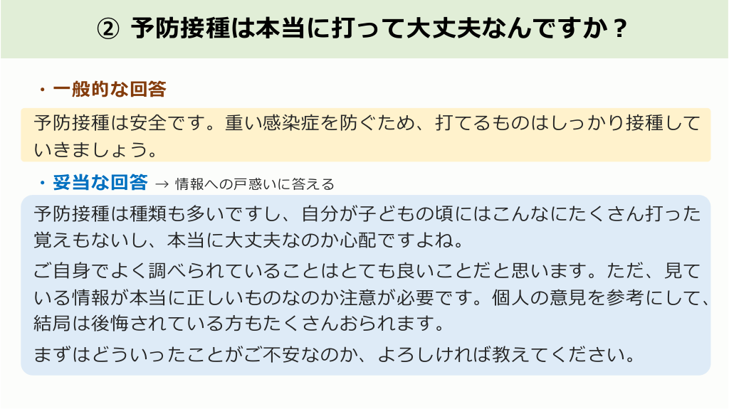 ② 予防接種は本当に打って⼤丈夫なんですか︖ ・⼀般的な回答 予防接種は安全です。重い感染症を防ぐため、打てるものはしっかり接種して いきましょう。 ・妥当な回答 → 情報への⼾惑いに答える 予防接種は種類も多いですし、⾃分が⼦どもの頃にはこんなにたくさん打った 覚えもないし、本当に⼤丈夫なのか⼼配ですよね。 ご⾃⾝でよく調べられていることはとても良いことだと思います。ただ、⾒て いる情報が本当に正しいものなのか注意が必要です。個⼈の意⾒を参考にして、 結局は後悔されている⽅もたくさんおられます。 まずはどういったことがご不安なのか、よろしければ教えてください。 離乳食の進め方とアレルギー対策 #13.