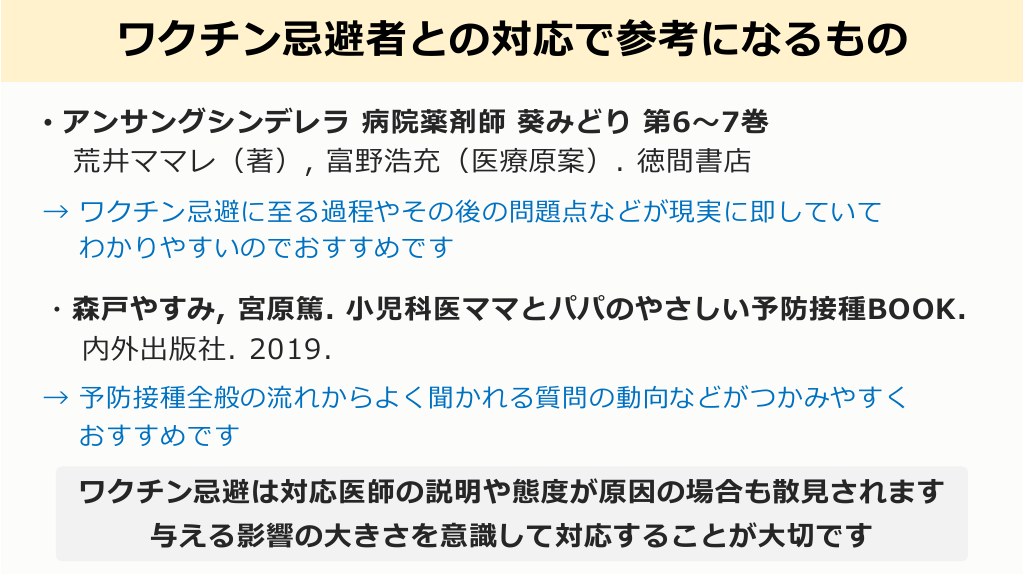 ワクチン忌避者との対応で参考になるもの • アンサングシンデレラ 病院薬剤師 葵みどり 第6〜7巻 荒井ママレ(著), 富野浩充(医療原案). 徳間書店 → ワクチン忌避に⾄る過程やその後の問題点などが現実に即していて わかりやすいのでおすすめです ・森⼾やすみ, 宮原篤. ⼩児科医ママとパパのやさしい予防接種BOOK. 内外出版社. 2019. → 予防接種全般の流れからよく聞かれる質問の動向などがつかみやすく おすすめです ワクチン忌避は対応医師の説明や態度が原因の場合も散⾒されます 与える影響の⼤きさを意識して対応することが⼤切です #14.