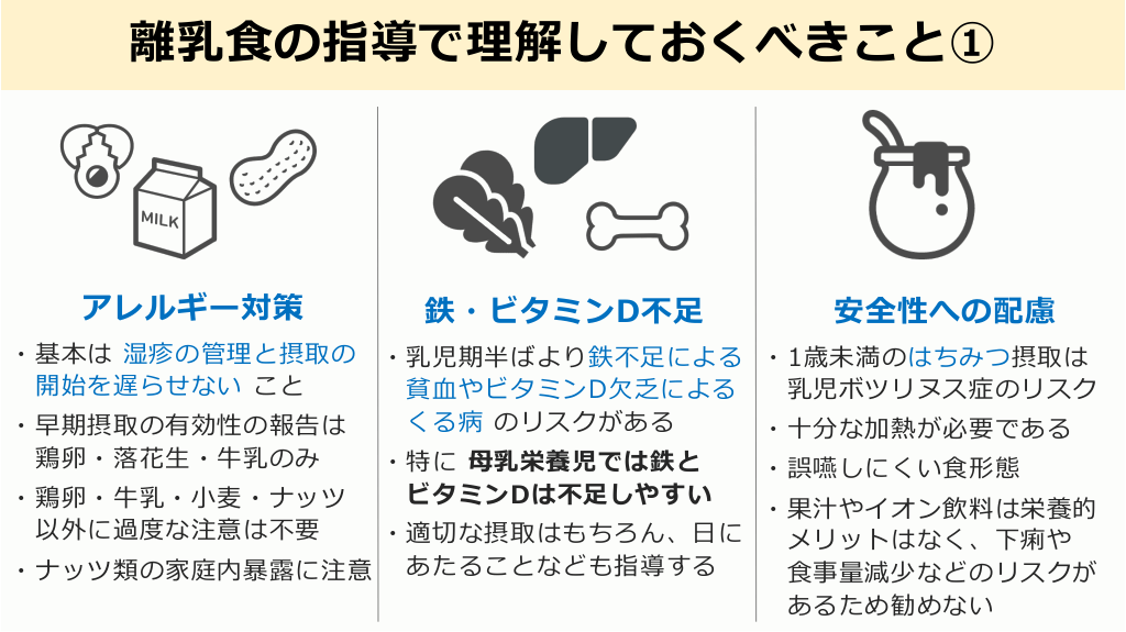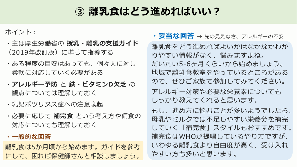 ③ 離乳⾷はどう進めればいい︖ ポイント︓ ・主は厚⽣労働省の 授乳・離乳の⽀援ガイド (2019年改訂版)に準じて指導する ・ある程度の⽬安はあっても、個々⼈に対し 柔軟に対応していく必要がある ・アレルギー予防 と 鉄・ビタミンD⽋乏 の 観点については理解しておく ・乳児ボツリヌス症への注意喚起 ・必要に応じて 補完⾷ という考え⽅や偏⾷の 対応についても理解しておく ・⼀般的な回答 離乳⾷は5か⽉頃から始めます。ガイドを参考 にして、困れば保健師さんと相談しましょう。 ・妥当な回答 → 先の⾒えなさ、アレルギーの不安 離乳⾷をどう進めればよいかはなかなかわか りやすい情報がなく、悩みますよね。 だいたい5-6ヶ⽉くらいから始めましょう。 地域で離乳⾷教室をやっているところがある ので、ぜひご家族で参加してみてください。 アレルギー対策や必要な栄養素についても しっかり教えてくれると思います。 もし、進め⽅に悩むことが多いようでしたら、 ⺟乳やミルクでは不⾜しやすい栄養分を補完 していく「補完⾷」スタイルもおすすめです。 補完⾷はWHOが提唱しているやり⽅ですが、 いわゆる離乳⾷より⾃由度が⾼く、受け⼊れ やすい⽅も多いと思います。 #15.