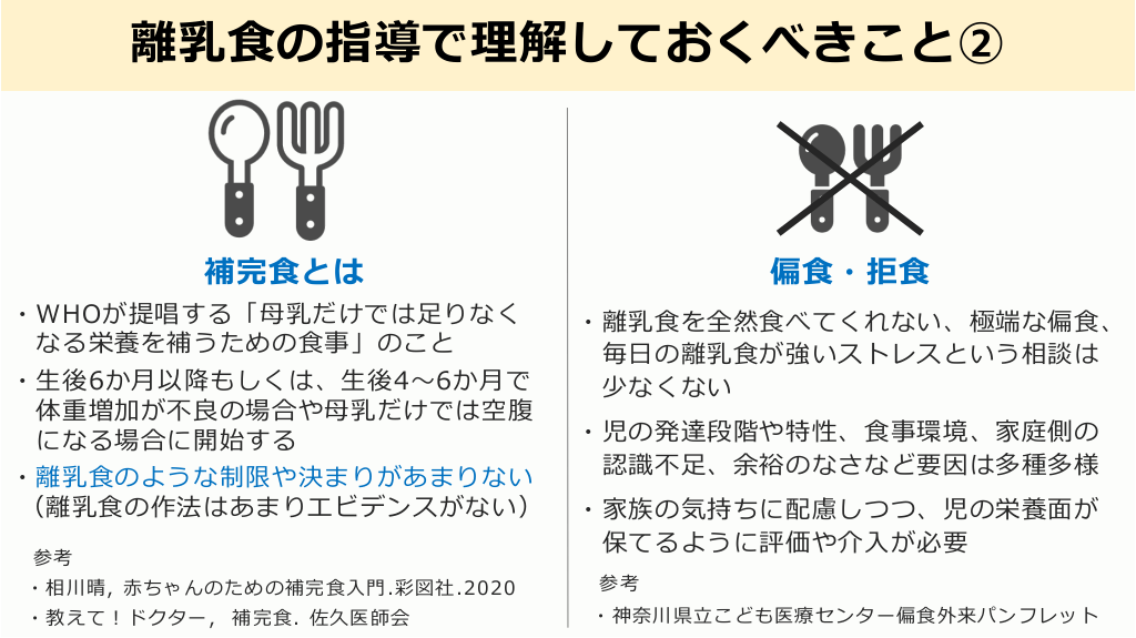 離乳⾷の指導で理解しておくべきこと② 補完⾷とは ・WHOが提唱する「⺟乳だけでは⾜りなく なる栄養を補うための⾷事」のこと ・⽣後6か⽉以降もしくは、⽣後4〜6か⽉で 体重増加が不良の場合や⺟乳だけでは空腹 になる場合に開始する ・離乳⾷のような制限や決まりがあまりない (離乳⾷の作法はあまりエビデンスがない) 参考 ・相川晴, ⾚ちゃんのための補完⾷⼊⾨.彩図社.2020 ・教えて︕ドクター, 補完⾷. 佐久医師会 偏⾷・拒⾷ ・離乳⾷を全然⾷べてくれない、極端な偏⾷、 毎⽇の離乳⾷が強いストレスという相談は 少なくない ・児の発達段階や特性、⾷事環境、家庭側の 認識不⾜、余裕のなさなど要因は多種多様 ・家族の気持ちに配慮しつつ、児の栄養⾯が 保てるように評価や介⼊が必要 参考 ・神奈川県⽴こども医療センター偏⾷外来パンフレット #17.