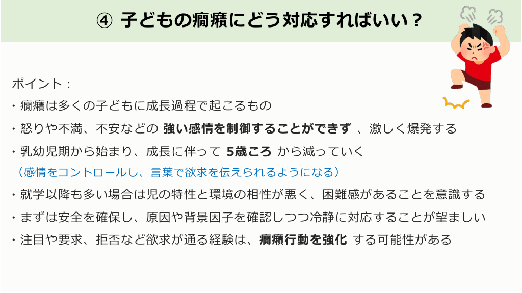 ④ ⼦どもの癇癪にどう対応すればいい︖ ポイント︓ ・癇癪は多くの⼦どもに成⻑過程で起こるもの ・怒りや不満、不安などの 強い感情を制御することができず 、激しく爆発する ・乳幼児期から始まり、成⻑に伴って 5歳ころ から減っていく (感情をコントロールし、⾔葉で欲求を伝えられるようになる) ・就学以降も多い場合は児の特性と環境の相性が悪く、困難感があることを意識する ・まずは安全を確保し、原因や背景因⼦を確認しつつ冷静に対応することが望ましい ・注⽬や要求、拒否など欲求が通る経験は、癇癪⾏動を強化 する可能性がある #18.