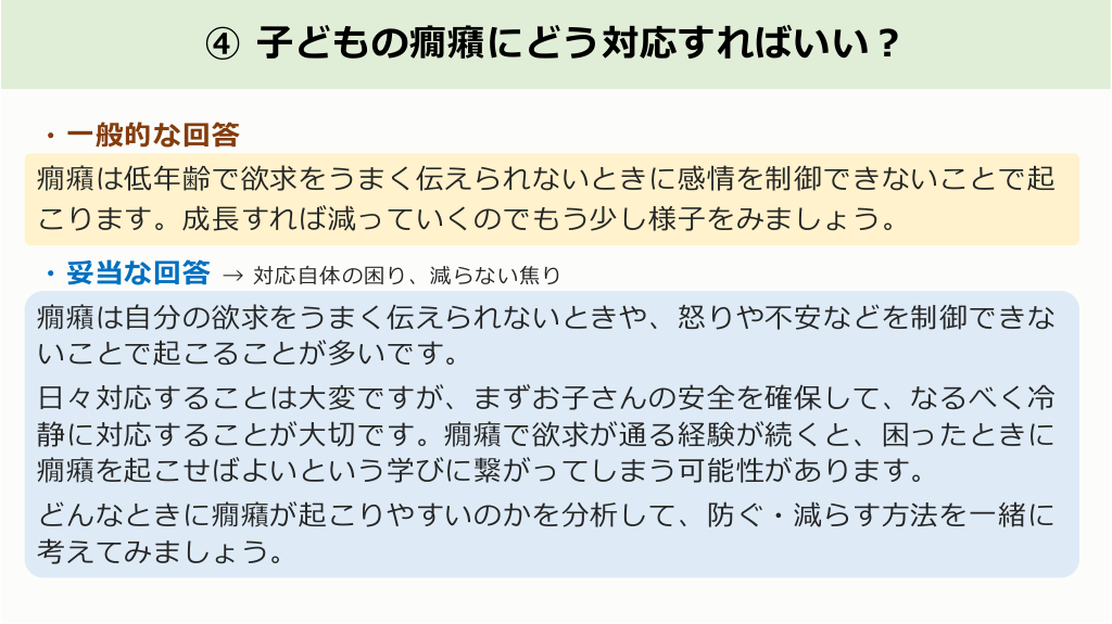 ④ ⼦どもの癇癪にどう対応すればいい︖ ・⼀般的な回答 癇癪は低年齢で欲求をうまく伝えられないときに感情を制御できないことで起 こります。成⻑すれば減っていくのでもう少し様⼦をみましょう。 ・妥当な回答 → 対応⾃体の困り、減らない焦り 癇癪は⾃分の欲求をうまく伝えられないときや、怒りや不安などを制御できな いことで起こることが多いです。 ⽇々対応することは⼤変ですが、まずお⼦さんの安全を確保して、なるべく冷 静に対応することが⼤切です。癇癪で欲求が通る経験が続くと、困ったときに 癇癪を起こせばよいという学びに繋がってしまう可能性があります。 どんなときに癇癪が起こりやすいのかを分析して、防ぐ・減らす⽅法を⼀緒に 考えてみましょう。 発達障害の理解と診断の必要性 #19.