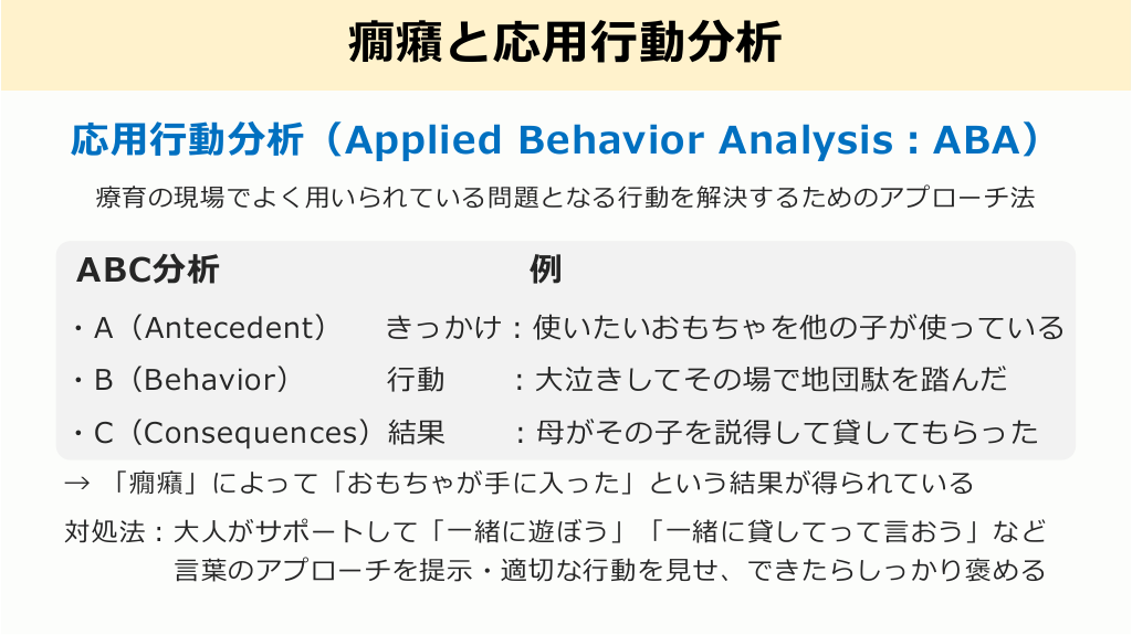 癇癪と応⽤⾏動分析 応⽤⾏動分析(Applied Behavior Analysis︓ABA) 療育の現場でよく⽤いられている問題となる⾏動を解決するためのアプローチ法 ABC分析 例 ・A(Antecedent) きっかけ︓使いたいおもちゃを他の⼦が使っている ・B(Behavior) ⾏動 ・C(Consequences)結果 ︓⼤泣きしてその場で地団駄を踏んだ ︓⺟がその⼦を説得して貸してもらった → 「癇癪」によって「おもちゃが⼿に⼊った」という結果が得られている 対処法︓⼤⼈がサポートして「⼀緒に遊ぼう」「⼀緒に貸してって⾔おう」など ⾔葉のアプローチを提⽰・適切な⾏動を⾒せ、できたらしっかり褒める #20.