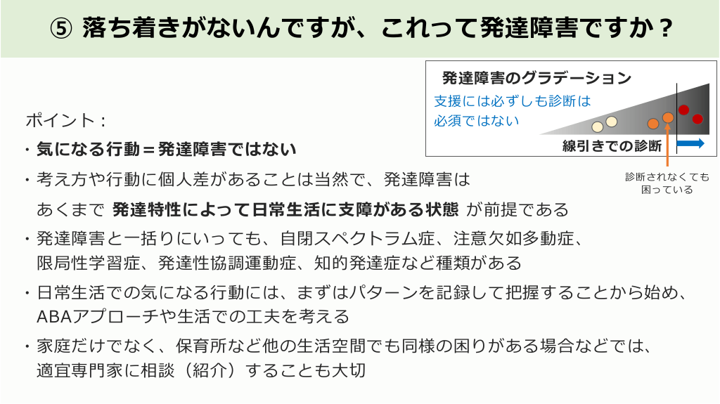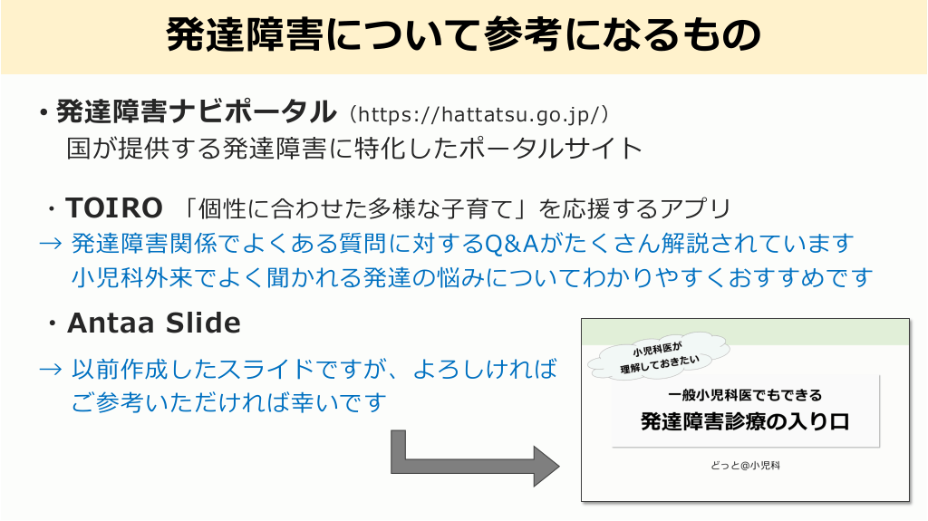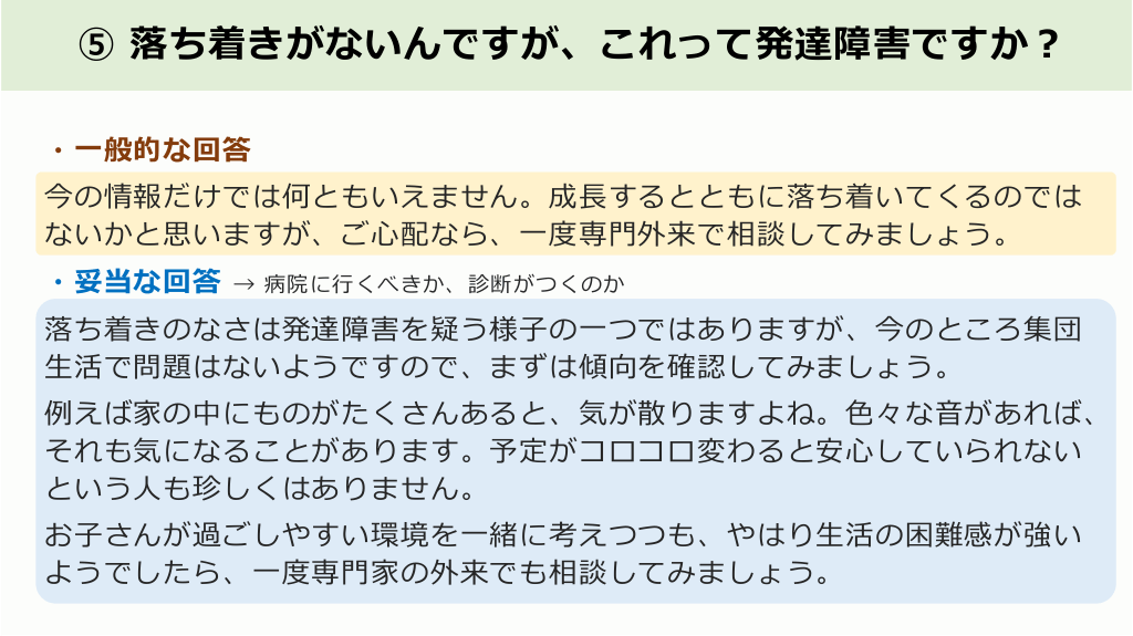 ⑤ 落ち着きがないんですが、これって発達障害ですか︖ ・⼀般的な回答 今の情報だけでは何ともいえません。成⻑するとともに落ち着いてくるのでは ないかと思いますが、ご⼼配なら、⼀度専⾨外来で相談してみましょう。 ・妥当な回答 → 病院に⾏くべきか、診断がつくのか 落ち着きのなさは発達障害を疑う様⼦の⼀つではありますが、今のところ集団 ⽣活で問題はないようですので、まずは傾向を確認してみましょう。 例えば家の中にものがたくさんあると、気が散りますよね。⾊々な⾳があれば、 それも気になることがあります。予定がコロコロ変わると安⼼していられない という⼈も珍しくはありません。 お⼦さんが過ごしやすい環境を⼀緒に考えつつも、やはり⽣活の困難感が強い ようでしたら、⼀度専⾨家の外来でも相談してみましょう。 発達障害に関する参考情報とまとめ #22. 発達障害について参考になるもの • 発達障害ナビポータル (https://hattatsu.go.jp /) 国が提供する発達障害に特化したポータルサイト ・ TOIRO 「個性に合わせた多様な⼦育て」を応援するアプリ → 発達障害関係でよくある質問に対するQ&Aがたくさん解説されています ⼩児科外来でよく聞かれる発達の悩みについてわかりやすくおすすめです ・Antaa Slide → 以前作成したスライドですが、よろしければ ご参考いただければ幸いです #23.