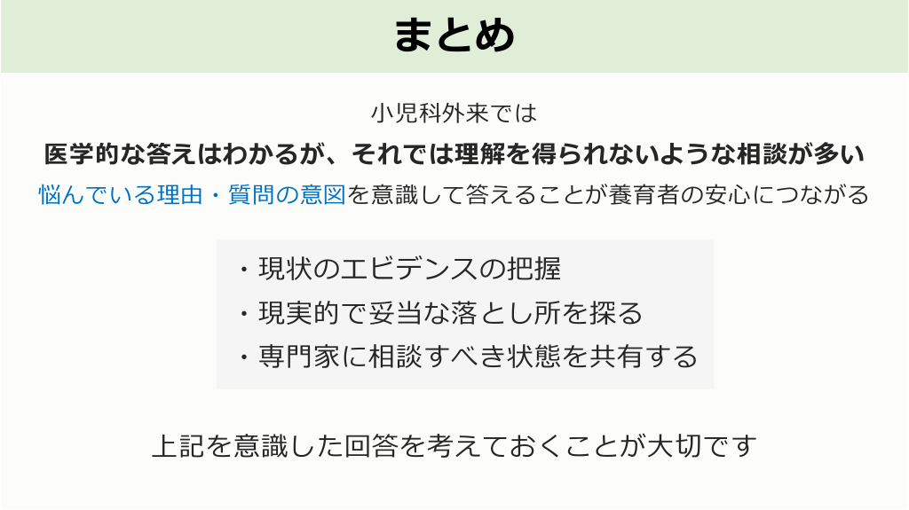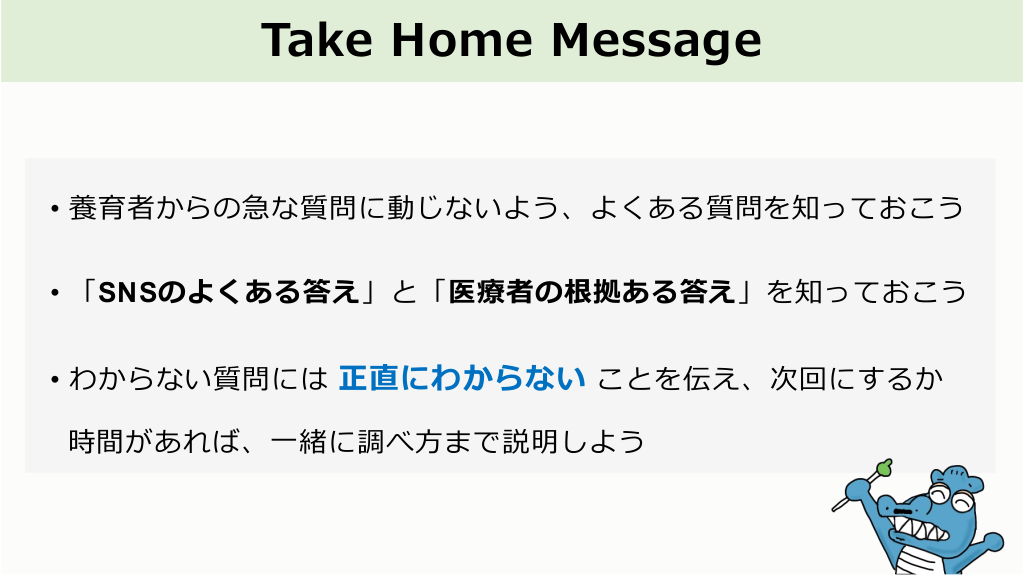 Take Home Message • 養育者からの急な質問に動じないよう、よくある質問を知っておこう • 「SNSのよくある答え」と「医療者の根拠ある答え」を知っておこう • わからない質問には 正直にわからない ことを伝え、次回にするか 時間があれば、⼀緒に調べ⽅まで説明しよう