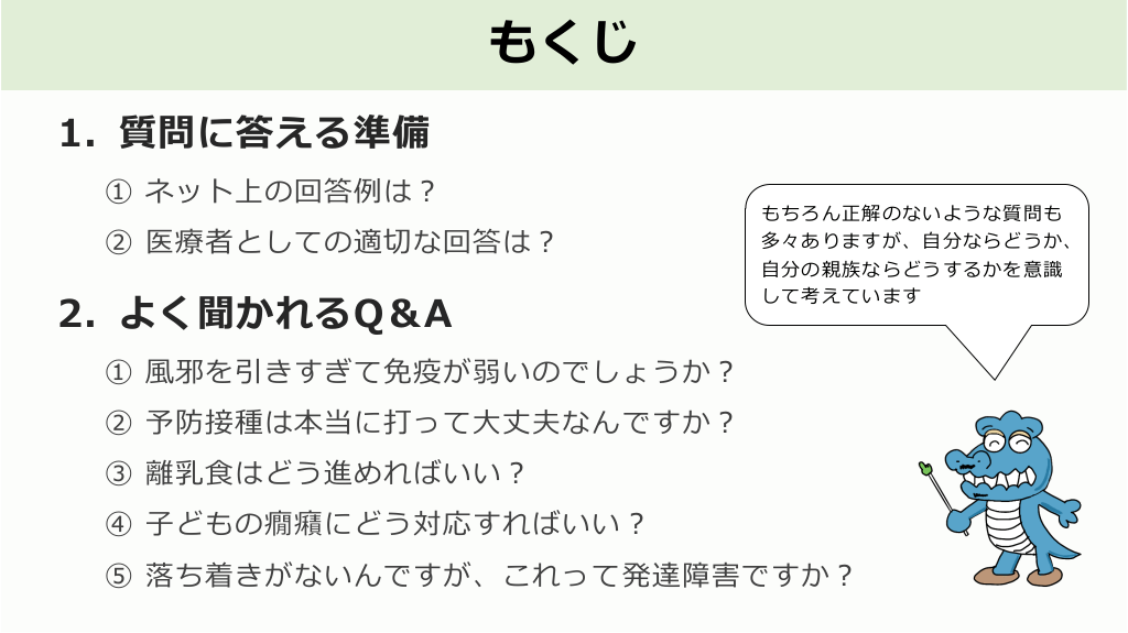 もくじ 1. 質問に答える準備 ① ネット上の回答例は︖ ② 医療者としての適切な回答は︖ 2. よく聞かれるQ&A もちろん正解のないような質問も 多々ありますが、⾃分ならどうか、 ⾃分の親族ならどうするかを意識 して考えています ① ⾵邪を引きすぎて免疫が弱いのでしょうか︖ ② 予防接種は本当に打って⼤丈夫なんですか︖ ③ 離乳⾷はどう進めればいい︖ ④ ⼦どもの癇癪にどう対応すればいい︖ ⑤ 落ち着きがないんですが、これって発達障害ですか︖ #5.