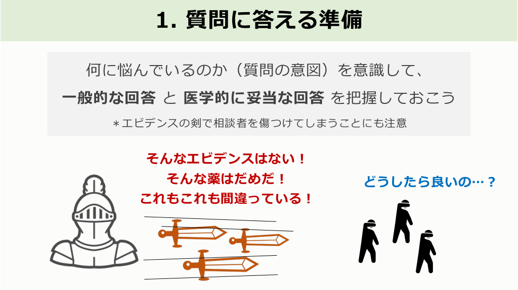 1. 質問に答える準備 何に悩んでいるのか(質問の意図)を意識して、 ⼀般的な回答 と 医学的に妥当な回答 を把握しておこう *エビデンスの剣で相談者を傷つけてしまうことにも注意 そんなエビデンスはない︕ そんな薬はだめだ︕ これもこれも間違っている︕ どうしたら良いの…︖ #6.