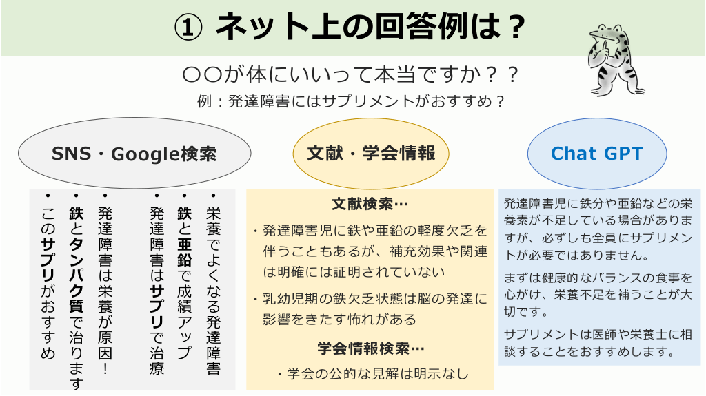 ① ネット上の回答例は︖ 〇〇が体にいいって本当ですか︖︖ 例︓発達障害にはサプリメントがおすすめ︖ SNS・ Google検索 • • • • • • こ の サ プ リ が お す す め 鉄 と タ ン パ ク 質 で 治 り ま す 発 達 障 害 は 栄 養 が 原 因 ︕ 発 達 障 害 は サ プ リ で 治 療 鉄 と 亜 鉛 で 成 績 ア = プ 栄 養 で よ く な る 発 達 障 害 ⽂献・学会情報 Chat GPT ⽂献検索… 発達障害児に鉄分や亜鉛などの栄 養素が不⾜している場合がありま すが、必ずしも全員にサプリメン トが必要ではありません。 ・発達障害児に鉄や亜鉛の軽度⽋乏を 伴うこともあるが、補充効果や関連 は明確には証明されていない ・乳幼児期の鉄⽋乏状態は脳の発達に 影響をきたす怖れがある 学会情報検索… ・学会の公的な⾒解は明⽰なし まずは健康的なバランスの⾷事を ⼼がけ、栄養不⾜を補うことが⼤ 切です。 サプリメントは医師や栄養⼠に相 談することをおすすめします。 医療者としての適切な回答とQ&Aの実例 #7.