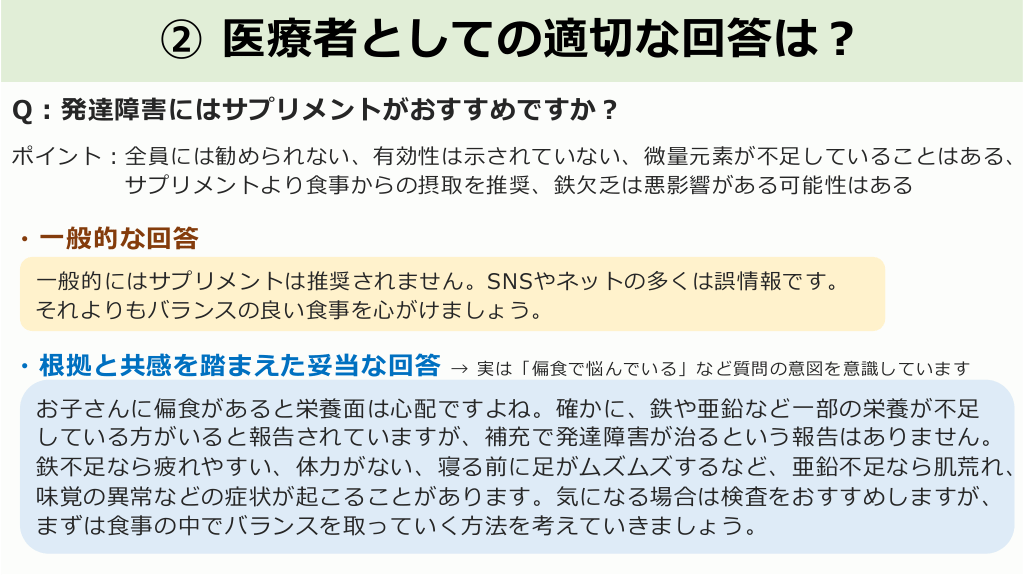 ② 医療者としての適切な回答は︖ Q︓発達障害にはサプリメントがおすすめですか︖ ポイント︓全員には勧められない、有効性は⽰されていない、微量元素が不⾜していることはある、 サプリメントより⾷事からの摂取を推奨、鉄⽋乏は悪影響がある可能性はある ・⼀般的な回答 ⼀般的にはサプリメントは推奨されません。SNSやネットの多くは誤情報です。 それよりもバランスの良い⾷事を⼼がけましょう。 ・根拠と共感を踏まえた妥当な回答 → 実は「偏⾷で悩んでいる」など質問の意図を意識しています お⼦さんに偏⾷があると栄養⾯は⼼配ですよね。確かに、鉄や亜鉛など⼀部の栄養が不⾜ している⽅がいると報告されていますが、補充で発達障害が治るという報告はありません。 鉄不⾜なら疲れやすい、体⼒がない、寝る前に⾜がムズムズするなど、亜鉛不⾜なら肌荒れ、 味覚の異常などの症状が起こることがあります。気になる場合は検査をおすすめしますが、 まずは⾷事の中でバランスを取っていく⽅法を考えていきましょう。 #8.