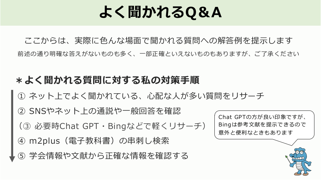 よく聞かれるQ&A ここからは、実際に⾊んな場⾯で聞かれる質問への解答例を提⽰します 前述の通り明確な答えがないものも多く、⼀部正確といえないものもありますが、ご了承ください *よく聞かれる質問に対する私の対策⼿順 ① ネット上でよく聞かれている、⼼配な⼈が多い質問をリサーチ ② SNSやネット上の通説や⼀般回答を確認 (③ 必要時Chat GPT・Bingなどで軽くリサーチ) ④ m2plus(電⼦教科書)の串刺し検索 ⑤ 学会情報や⽂献から正確な情報を確認する Chat GPTの⽅が良い印象ですが、 Bingは参考⽂献を提⽰できるので 意外と便利なときもあります 風邪と免疫の関係、免疫不全症の徴候 #9.