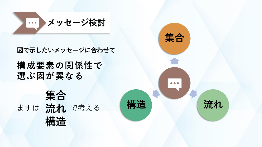 #2. メッセージ検討 集合 図で示したいメッセージに合わせて 構成要素の関係性で 選ぶ図が異なる まずは 集合 流れ 構造 で考える 構造 流れ