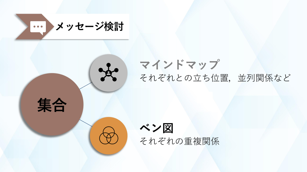#3. メッセージ検討 マインドマップ それぞれとの立ち位置,並列関係など 集合 ベン図 それぞれの重複関係