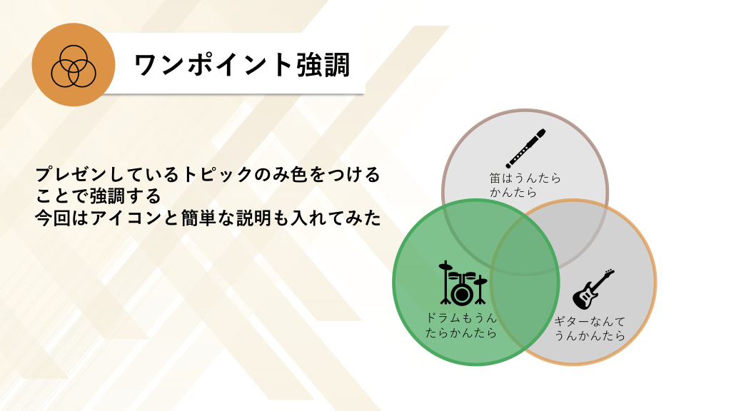 #7. ワンポイント強調 プレゼンしているトピックのみ色をつける ことで強調する 今回はアイコンと簡単な説明も入れてみた 笛はうんたら かんたら ドラムもうん たらかんたら ギターなんて うんかんたら