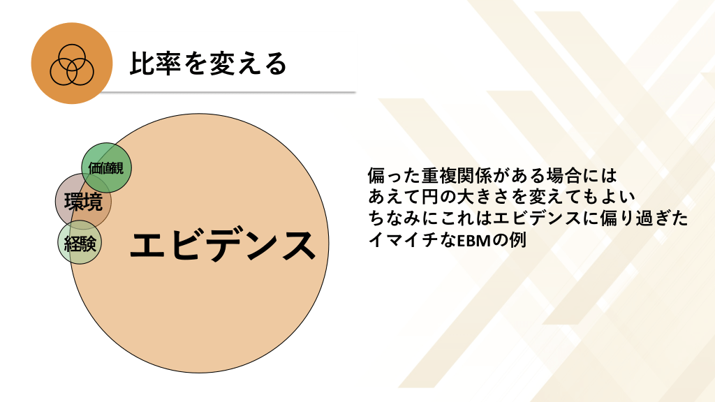 #9. 比率を変える 価値観 環境 経験 エビデンス 偏った重複関係がある場合には あえて円の大きさを変えてもよい ちなみにこれはエビデンスに偏り過ぎた イマイチなEBMの例