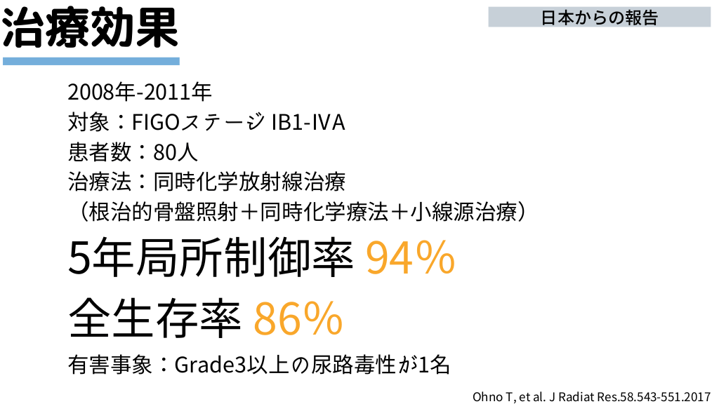 #10. 日本からの報告 治療効果 2008年-2011年 対象:FIGOステージ IB1-ⅣA 患者数:80人 治療法:同時化学放射線治療 (根治的骨盤照射+同時化学療法+小線源治療) 5年局所制御率 94% 全生存率 86% 有害事象:Grade3以上の尿路毒性が1名 Ohno T, et al. J Radiat Res.58.543-551.2017