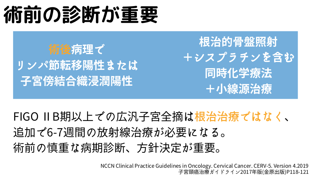 #11. 術前の診断が重要 術後病理で リンパ節転移陽性または 子宮傍結合織浸潤陽性 根治的骨盤照射 +シスプラチンを含む 同時化学療法 +小線源治療 FIGO ⅡB期以上での広汎子宮全摘は根治治療ではなく、 追加で6-7週間の放射線治療が必要になる。 術前の慎重な病期診断、方針決定が重要。 NCCN Clinical Practice Guidelines in Oncology. Cervical Cancer. CERV-5. Version 4.2019 子宮頸癌治療ガイドライン2017年版(金原出版)P118-121