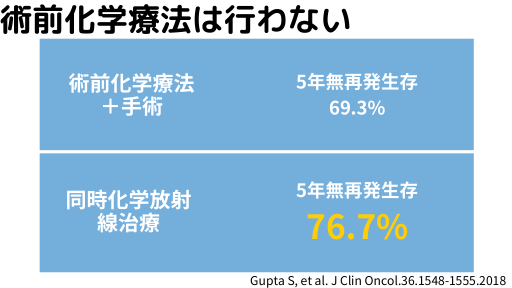 #12. 術前化学療法は行わない 術前化学療法 +手術 5年無再発生存 69.3% 同時化学放射 線治療 5年無再発生存 76.7% Gupta S, et al. J Clin Oncol.36.1548-1555.2018