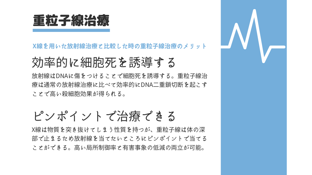 #14. 重粒子線治療 X線を用いた放射線治療と比較した時の重粒子線治療のメリット 効率的に細胞死を誘導する 放射線はDNAに傷をつけることで細胞死を誘導する。重粒子線治 療は通常の放射線治療に比べて効率的にDNA二重鎖切断を起こす ことで高い殺細胞効果が得られる。 ピンポイントで治療できる X線は物質を突き抜けてしまう性質を持つが、重粒子線は体の深 部で止まるため放射線を当てたいところにピンポイントで当てる ことができる。高い局所制御率と有害事象の低減の両立が可能。