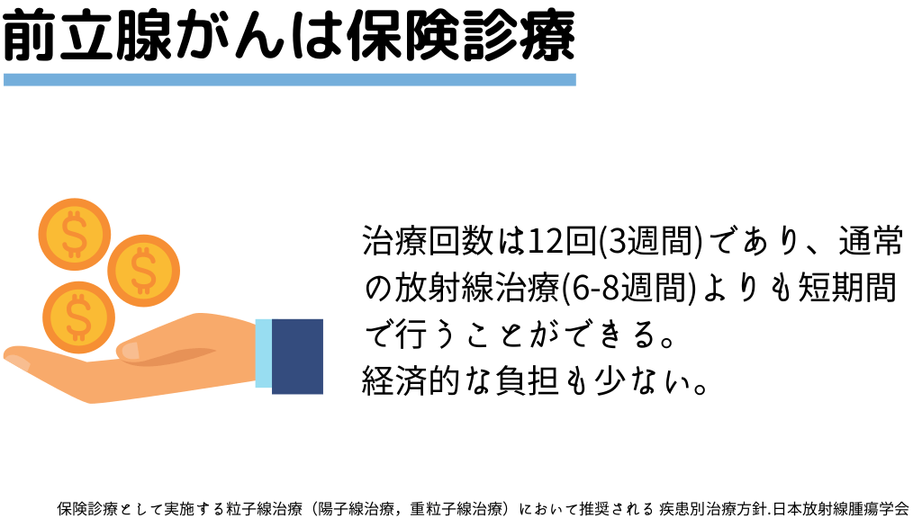 #16. 前立腺がんは保険診療 治療回数は12回(3週間)であり、通常 の放射線治療(6-8週間)よりも短期間 で行うことができる。 経済的な負担も少ない。 保険診療として実施する粒子線治療(陽子線治療,重粒子線治療)において推奨される 疾患別治療方針.日本放射線腫瘍学会
