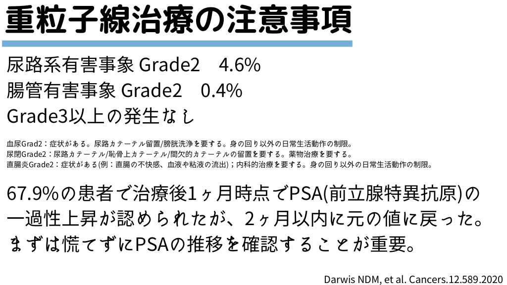 #18. 重粒子線治療の注意事項 尿路系有害事象 Grade2 4.6% 腸管有害事象 Grade2 0.4% Grade3以上の発生なし 血尿Grad2:症状がある。尿路カテーテル留置/膀胱洗浄を要する。身の回り以外の日常生活動作の制限。 尿閉Grade2:尿路カテーテル/恥骨上カテーテル/間欠的カテーテルの留置を要する。薬物治療を要する。 直腸炎Grade2:症状がある(例:直腸の不快感、血液や粘液の流出);内科的治療を要する。身の回り以外の日常生活動作の制限。 67.9%の患者で治療後1ヶ月時点でPSA(前立腺特異抗原)の 一過性上昇が認められたが、2ヶ月以内に元の値に戻った。 まずは慌てずにPSAの推移を確認することが重要。 Darwis NDM, et al. Cancers.12.589.2020