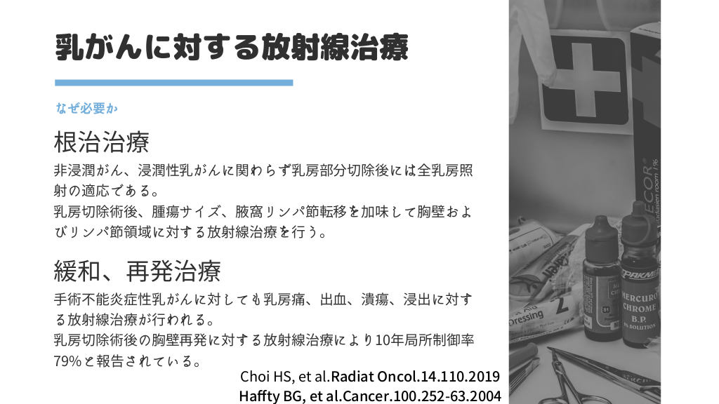 #19. 乳がんに対する放射線治療 なぜ必要か 根治治療 非浸潤がん、浸潤性乳がんに関わらず乳房部分切除後には全乳房照 射の適応である。 乳房切除術後、腫瘍サイズ、腋窩リンパ節転移を加味して胸壁およ びリンパ節領域に対する放射線治療を行う。 緩和、再発治療 手術不能炎症性乳がんに対しても乳房痛、出血、潰瘍、浸出に対す る放射線治療が行われる。 乳房切除術後の胸壁再発に対する放射線治療により10年局所制御率 79%と報告されている。 Choi HS, et al.Radiat Oncol.14.110.2019 Haffty BG, et al.Cancer.100.252-63.2004