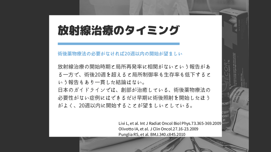 #20. 放射線治療のタイミング 術後薬物療法の必要がなければ20週以内の開始が望ましい 放射線治療の開始時期と局所再発率に相関がないという報告があ る一方で、術後20週を超えると局所制御率も生存率も低下すると いう報告もあり一貫した結論はない。 日本のガイドラインでは、創部が治癒している、術後薬物療法の 必要性がない症例にはできるだけ早期に術後照射を開始したほう がよく、20週以内に開始することが望ましいとしている。 Livi L, et al. Int J Radiat Oncol Biol Phys.73.365-369.2009 Olivotto IA, et al. J Clin Oncol.27.16-23.2009 Punglia RS, et al. BMJ.340.c845.2010
