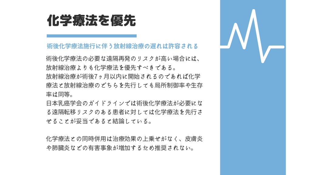 #21. 化学療法を優先 術後化学療法施行に伴う放射線治療の遅れは許容される 術後化学療法の必要な遠隔再発のリスクが高い場合には、 放射線治療よりも化学療法を優先すべきである。 放射線治療が術後7ヶ月以内に開始されるのであれば化学 療法と放射線治療のどちらを先行しても局所制御率や生存 率は同等。 日本乳癌学会のガイドラインでは術後化学療法が必要にな る遠隔転移リスクのある患者に対しては化学療法を先行さ せることが妥当であると結論している。 化学療法との同時併用は治療効果の上乗せがなく、皮膚炎 や肺臓炎などの有害事象が増加するため推奨されない。