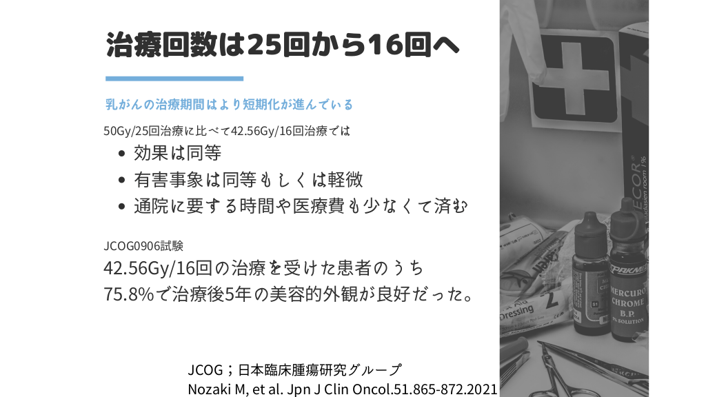 #22. 治療回数は25回から16回へ 乳がんの治療期間はより短期化が進んでいる 50Gy/25回治療に比べて42.56Gy/16回治療では 効果は同等 有害事象は同等もしくは軽微 通院に要する時間や医療費も少なくて済む JCOG0906試験 42.56Gy/16回の治療を受けた患者のうち 75.8%で治療後5年の美容的外観が良好だった。 JCOG;日本臨床腫瘍研究グループ Nozaki M, et al. Jpn J Clin Oncol.51.865-872.2021