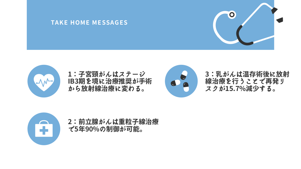 #2. TA K E H O ME ME S S A G E S 1:子宮頸がんはステージ IB3期を境に治療推奨が手術 から放射線治療に変わる。 2:前立腺がんは重粒子線治療 で5年90%の制御が可能。 3:乳がんは温存術後に放射 線治療を行うことで再発リ スクが15.7%減少する。