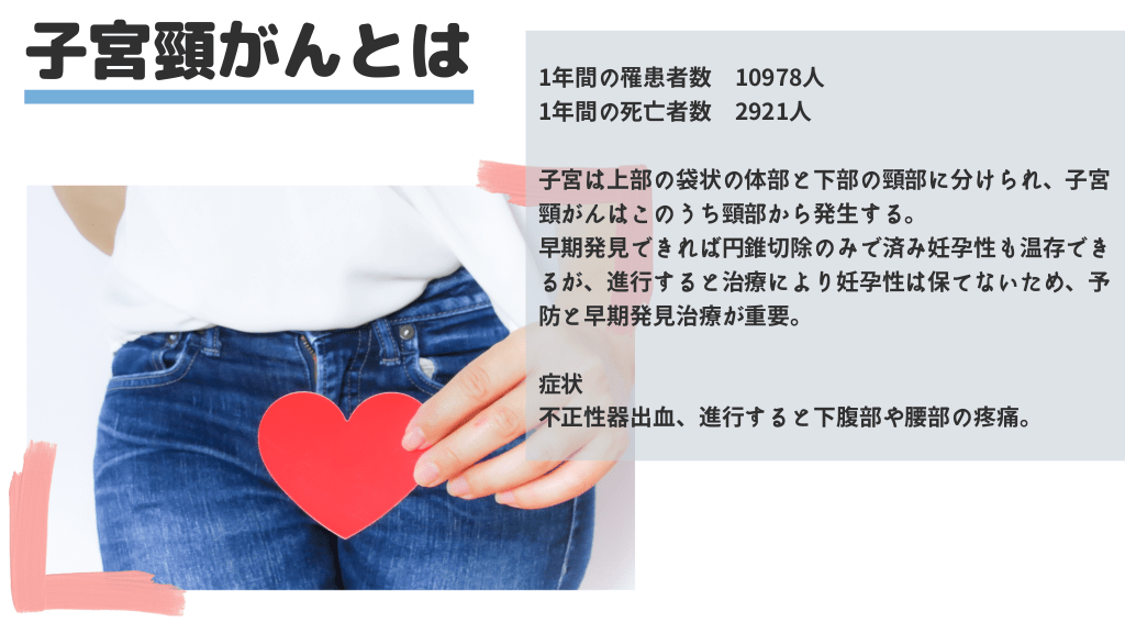 #3. 子宮頸がんとは 1年間の罹患者数 10978人 1年間の死亡者数 2921人 子宮は上部の袋状の体部と下部の頸部に分けられ、子宮 頸がんはこのうち頸部から発生する。 早期発見できれば円錐切除のみで済み妊孕性も温存でき るが、進行すると治療により妊孕性は保てないため、予 防と早期発見治療が重要。 症状 不正性器出血、進行すると下腹部や腰部の疼痛。