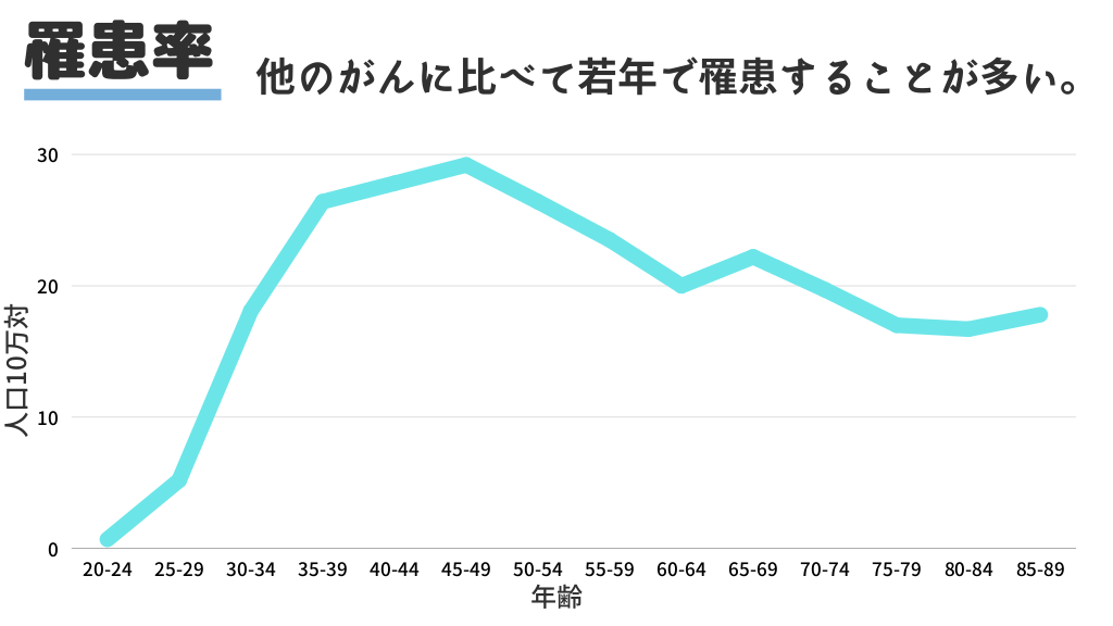 #4. 罹患率 他のがんに比べて若年で罹患することが多い。 30 対万01口人 20 10 0 20-24 25-29 30-34 35-39 40-44 45-49 50-54 55-59 60-64 65-69 70-74 75-79 80-84 85-89 年齢