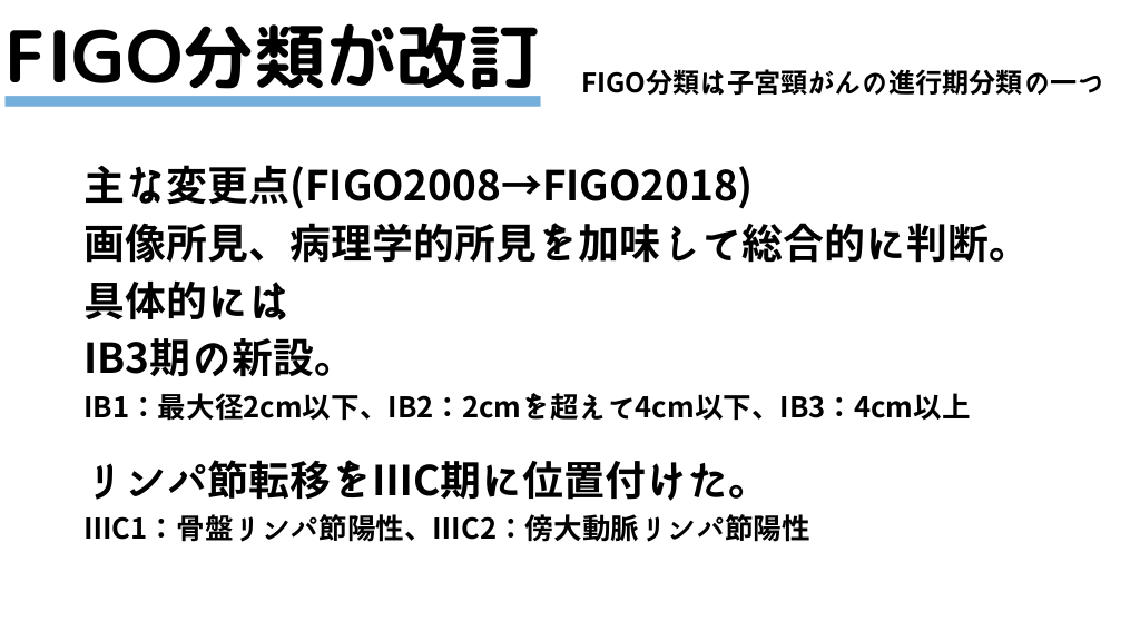 #5. FIGO分類が改訂 FIGO分類は子宮頸がんの進行期分類の一つ 主な変更点(FIGO2008→FIGO2018) 画像所見、病理学的所見を加味して総合的に判断。 具体的には IB3期の新設。 IB1:最大径2cm以下、IB2:2cmを超えて4cm以下、IB3:4cm以上 リンパ節転移をⅢC期に位置付けた。 ⅢC1:骨盤リンパ節陽性、ⅢC2:傍大動脈リンパ節陽性