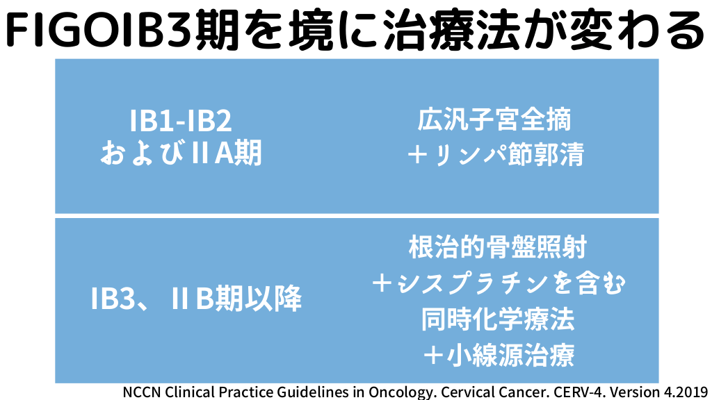 #6. FIGOⅠB3期を境に治療法が変わる IB1-IB2 およびⅡA期 IB3、ⅡB期以降 広汎子宮全摘 +リンパ節郭清 根治的骨盤照射 +シスプラチンを含む 同時化学療法 +小線源治療 NCCN Clinical Practice Guidelines in Oncology. Cervical Cancer. CERV-4. Version 4.2019