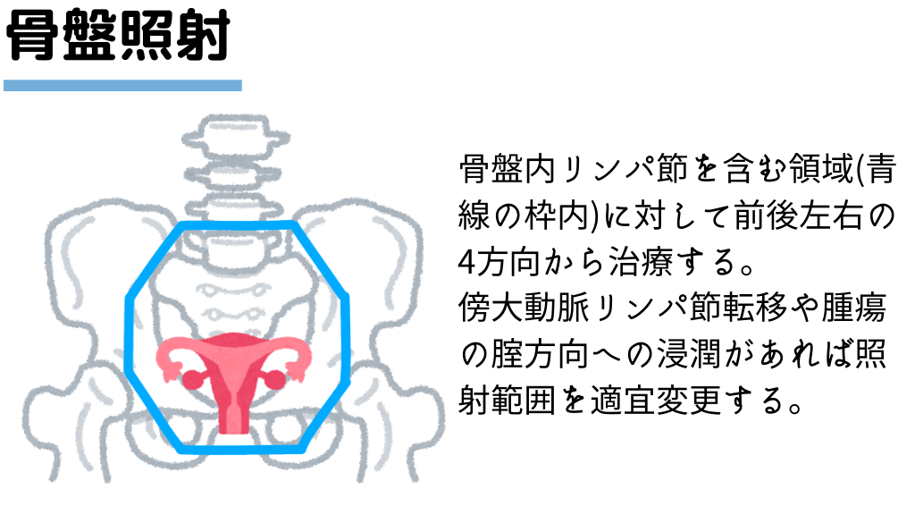 #8. 骨盤照射 骨盤内リンパ節を含む領域(青 線の枠内)に対して前後左右の 4方向から治療する。 傍大動脈リンパ節転移や腫瘍 の腟方向への浸潤があれば照 射範囲を適宜変更する。