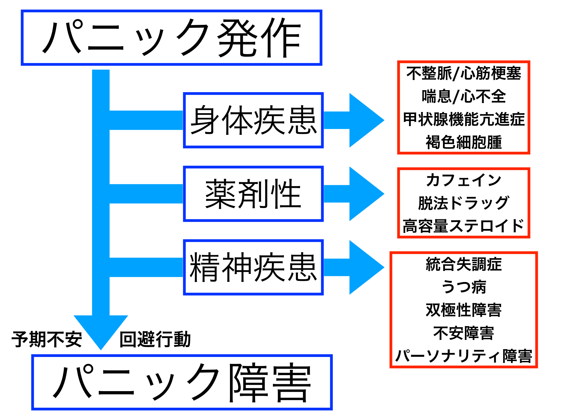 #10. パニック発作 身体疾患 薬剤性 精神疾患 予期不安 回避行動 パニック障害 不整脈/心筋梗塞 喘息/心不全 甲状腺機能亢進症 褐色細胞腫 カフェイン 脱法ドラッグ 高容量ステロイド 統合失調症 うつ病 双極性障害 不安障害 パーソナリティ障害