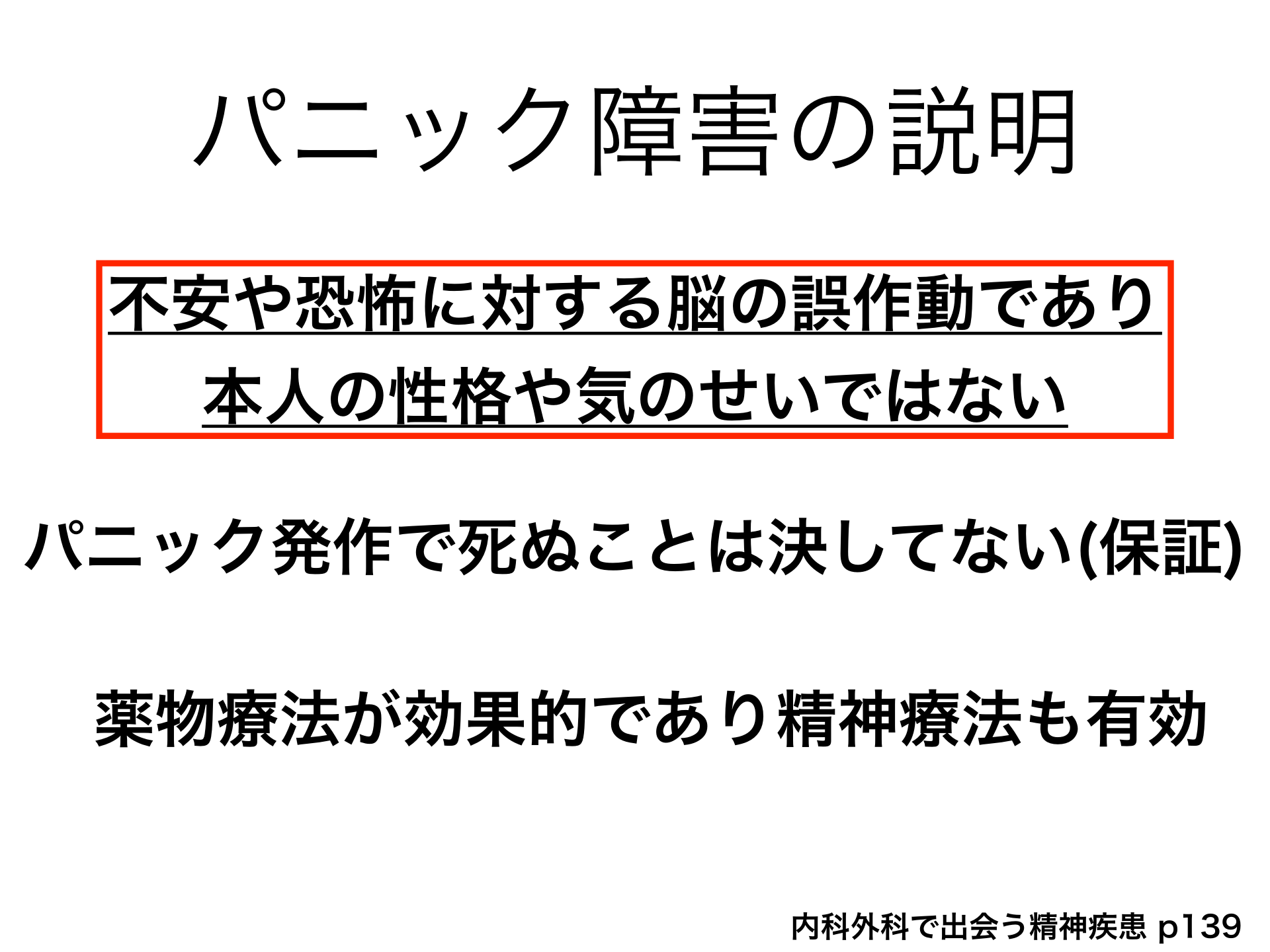 #12. パニック障害の説明 不安や恐怖に対する脳の誤作動であり 本人の性格や気のせいではない パニック発作で死ぬことは決してない(保証) 薬物療法が効果的であり精神療法も有効 内科外科で出会う精神疾患 p139