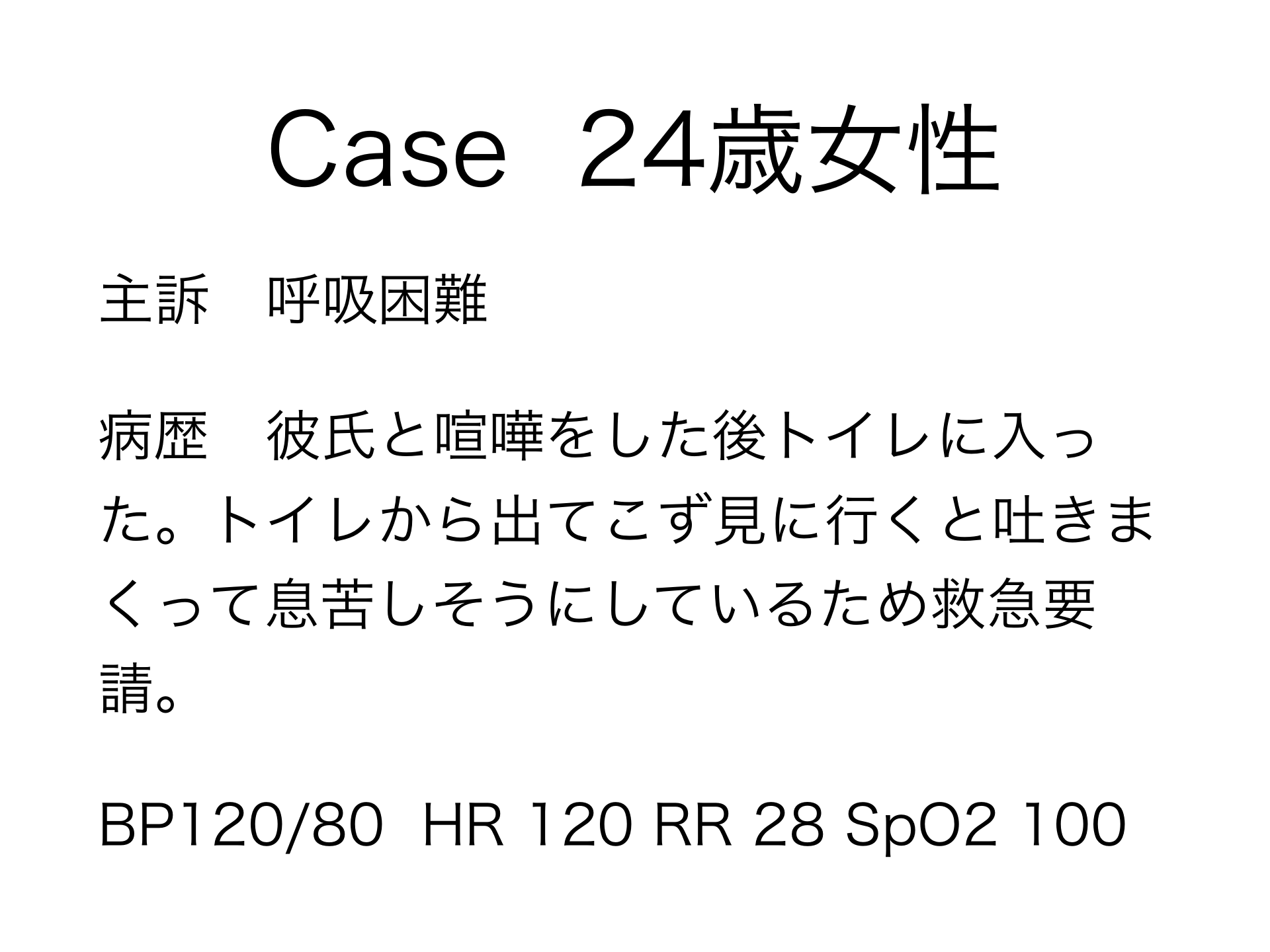#14. Case 24歳女性 主訴 呼吸困難 病歴 彼氏と喧嘩をした後トイレに入っ た。トイレから出てこず見に行くと吐きま くって息苦しそうにしているため救急要 請。 BP120/80 HR 120 RR 28 SpO2 100