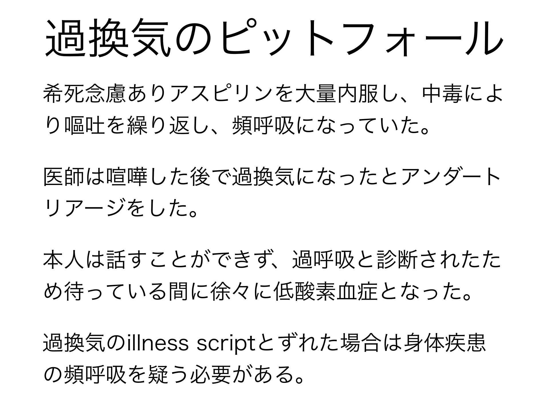 #17. 過換気のピットフォール 希死念慮ありアスピリンを大量内服し、中毒によ り嘔吐を繰り返し、頻呼吸になっていた。 医師は喧嘩した後で過換気になったとアンダート リアージをした。 本人は話すことができず、過呼吸と診断されたた め待っている間に徐々に低酸素血症となった。 過換気のillness scriptとずれた場合は身体疾患 の頻呼吸を疑う必要がある。